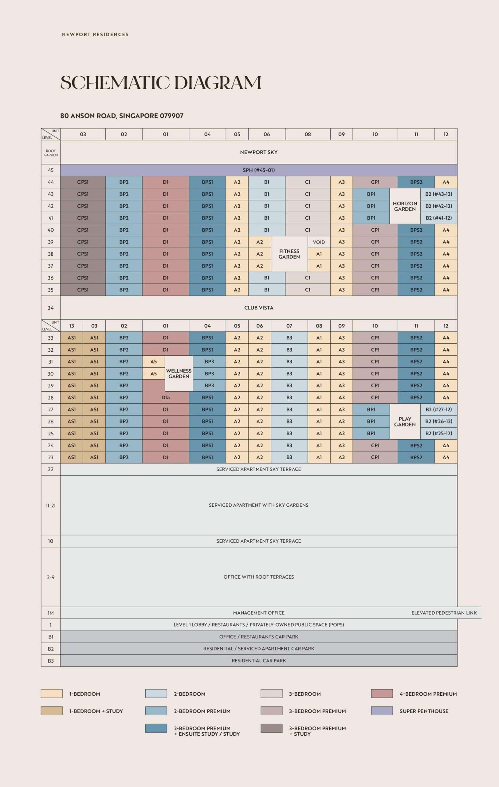 The Newport Residences Elevation Chart here shows you all the stacks (i.e. unit number) that are available within the tower. This way, when you are deciding on which unit you’d like to go for, it’s easier to locate the right unit by referring to the stack number.